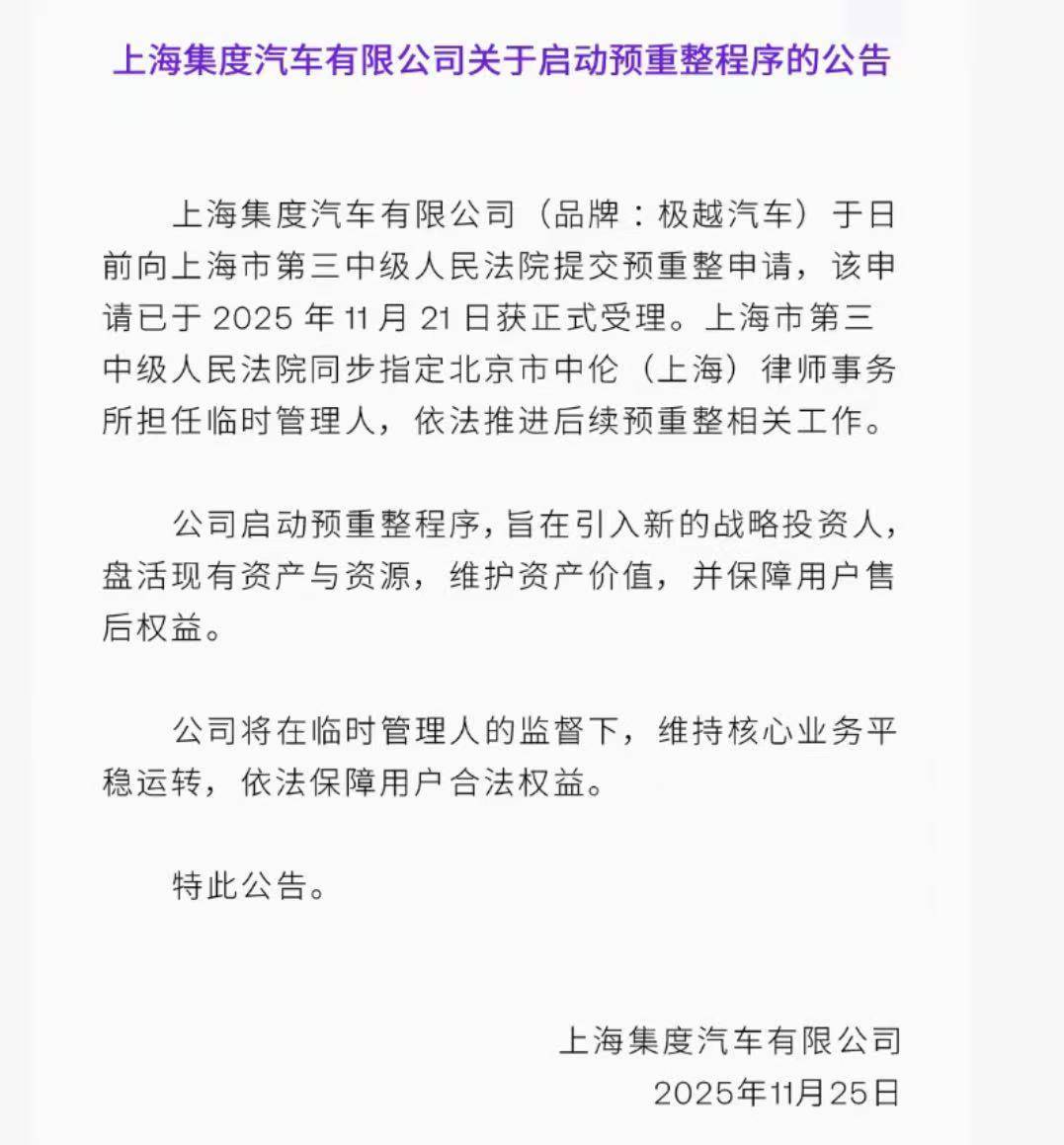 上海集度汽车有限公司(品牌:极越汽车)近日启动预重整程序,试图通过引入新的战略投资方盘活资产、保障用户权益。据公开信息显示,该公司已向上海市第三中级人民法院提交申请,并于2025年11月21日获得正式受理。法院同时指定北京市中伦(上海)律师事务所作为临时管理人,监督后续预重整工作的推进。