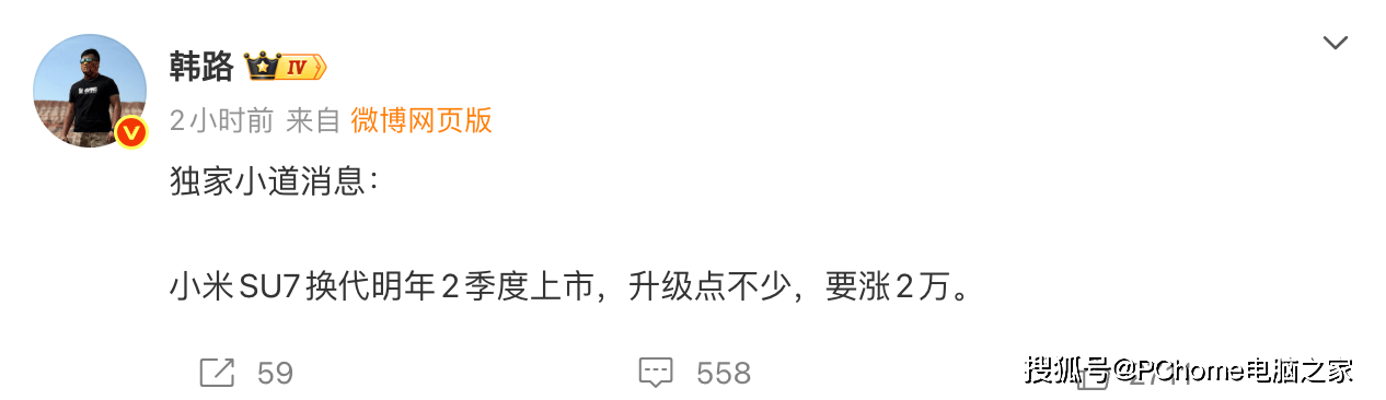 近日,汽车领域知名博主“韩路”在社交媒体上透露了一则关于小米SU7换代车型的独家消息,引发广泛关注。据悉,这款备受期待的新车计划于2026年第二季度正式上市,且在价格方面将有调整,起售价预计从现款的21.59万元上涨至23.59万元,涨幅达2万元。