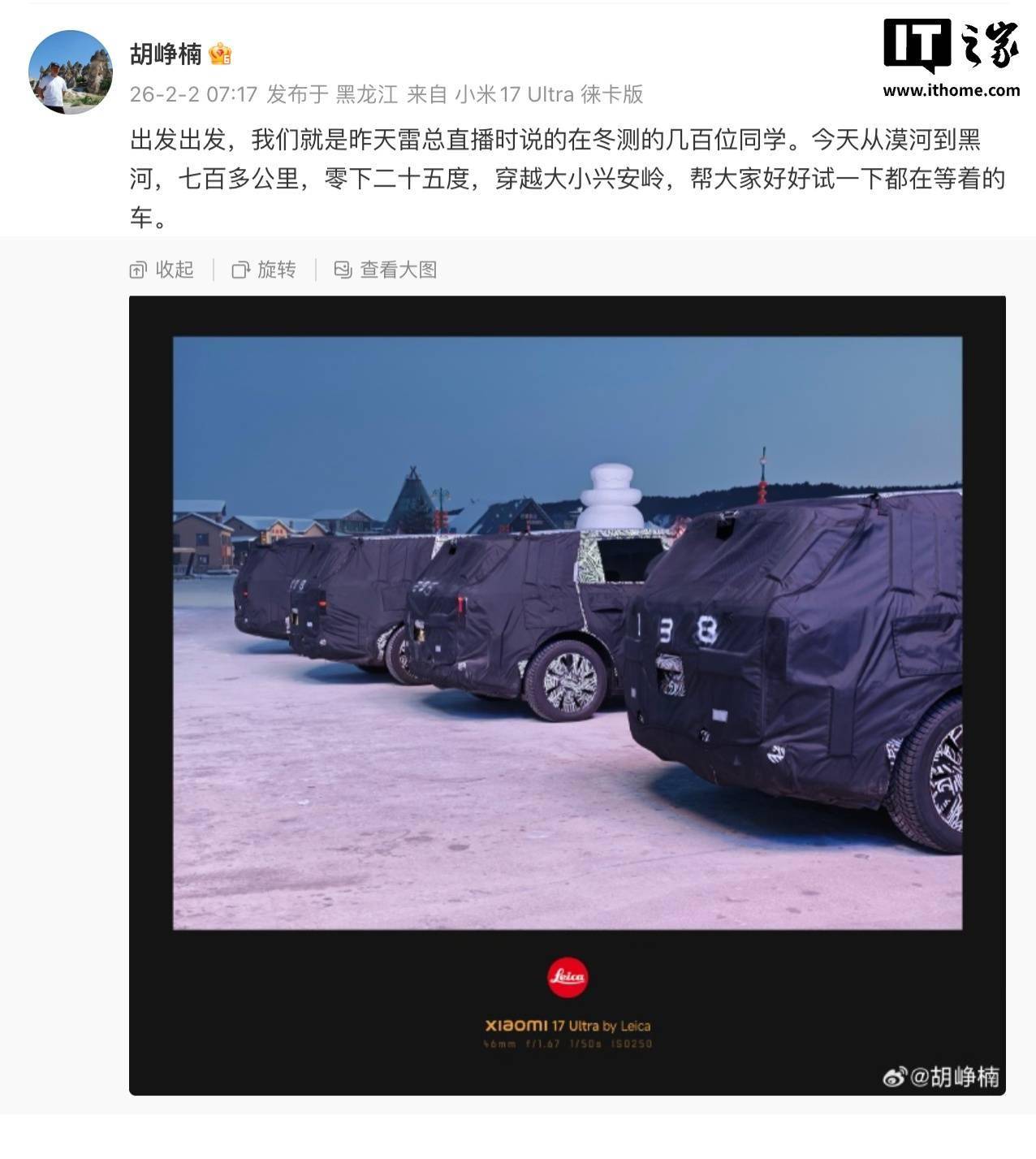 顺为资本投资合伙人胡峥楠近日在社交平台发布动态,透露其带领团队在极寒环境下开展车辆测试工作。从漠河到黑河的七百多公里行程中,测试车队穿越大小兴安岭,在零下二十五度的低温条件下对多款伪装车型进行实地验证。此次公开的测试画面显示,四台覆盖迷彩伪装的SUV车型同时现身,从车身轮廓判断属于不同细分市场,其中包含小米汽车首款增程式SUV的工程测试车。