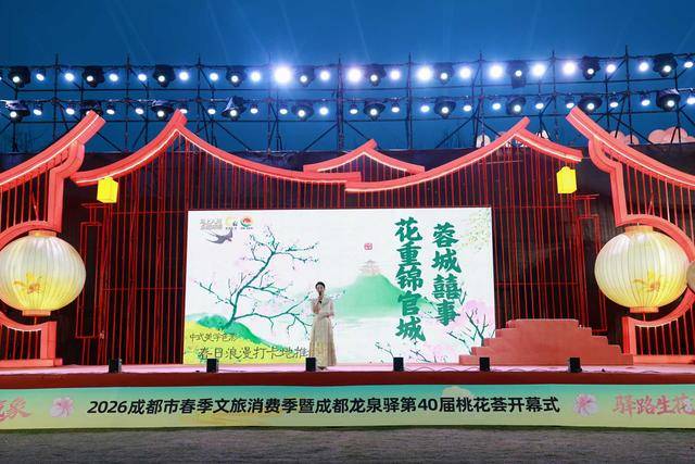 华灯初上,东安湖畔被璀璨灯光装点得如梦似幻。随着灯光秀与冷焰火在夜空中同步绽放,2026成都市春季文旅消费季暨成都龙泉驿第40届桃花荟正式启幕。这场以“‘驿’路生花·万千气象”为主题的文旅盛会,宛如一张精美的春日请柬,向八方游客发出热情邀约。