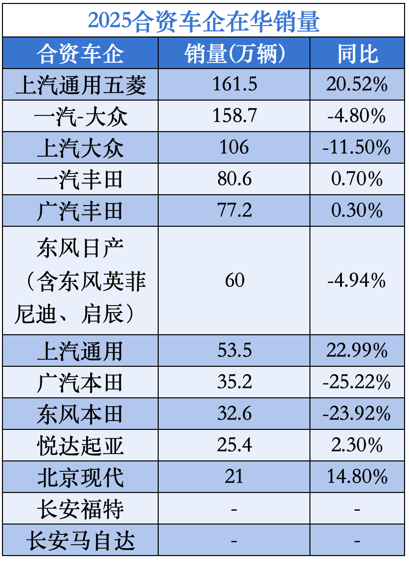 美系品牌展现强劲复苏势头。上汽通用全年销量达53.5万辆,同比增长22.9%,其新能源车型渗透率在合资阵营中位居首位;上汽通用五菱更以161.5万辆的销量实现20.5%的同比增长。韩系品牌同样交出亮眼成绩单:北京现代销量突破21万辆,同比增长14.8%;悦达起亚全年销量达25.4万辆,其中出口规模达53.7万辆,覆盖东南亚、中东等30余个市场。