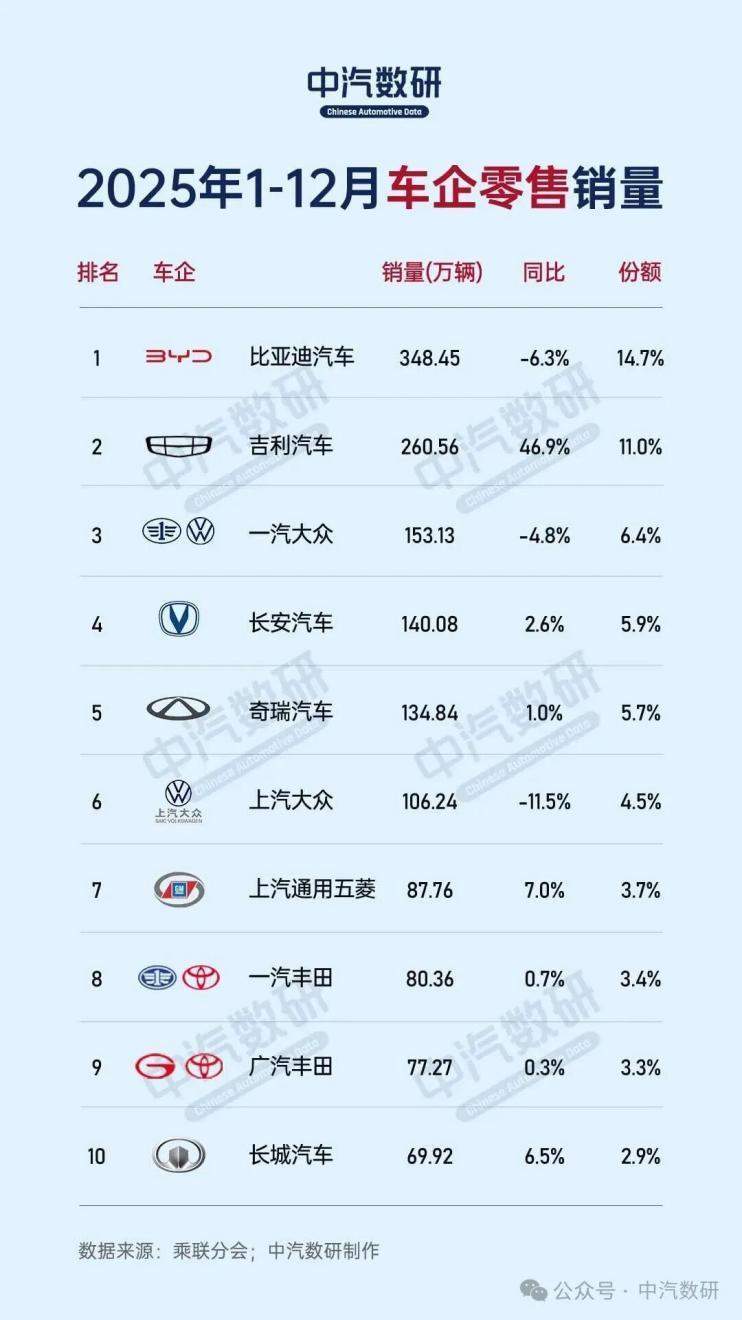 中国汽车市场在2025年迎来新一轮格局重塑,中汽协最新数据显示,中国品牌乘用车全年销量占比达69.5%,较上年提升近8个百分点,而合资车企整体市场份额压缩至30.5%。这一变化背后,是德系、日系品牌普遍承压与美系、韩系品牌逆势上扬的鲜明对比,折射出行业电动化转型的深层博弈。