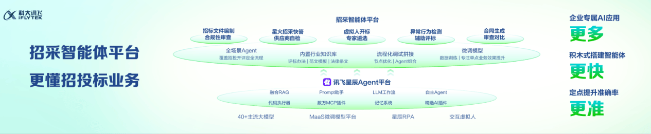 平台架构呈现显著的技术集成特征:星辰RPA组件突破传统自动化工具的局限,实现跨系统、跨软件的稳定操作;MaaS模型精调平台支持企业上传行业数据,40分钟即可完成场景化模型优化;数十个预置专业Agent覆盖招标公告生成、投标文件解析、智能评标等核心环节,形成完整的业务工具链。这种"基础能力+垂直应用"的组合模式,既保证技术通用性又兼顾行业特殊性。