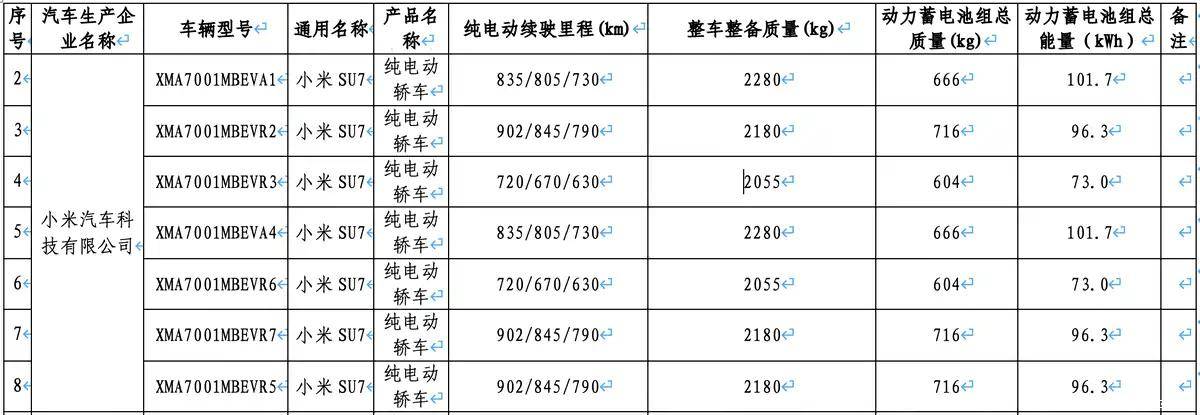 工信部最新发布的《减免车辆购置税的新能源汽车车型目录(第二十七批)》中,新一代小米SU7的详细参数首次曝光。这款新车将提供73kWh、96.3kWh、101.7kWh三种电池容量选择,对应CLTC工况下九种续航版本,续航里程覆盖630km至902km区间。其中标准版续航从700km提升至720km,Pro版从830km跃升至902km,Max版则由800km增至835km。