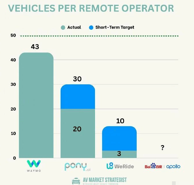 报告首次披露四大自动驾驶企业的"人机比"数据:Waymo以1:43的配比领先全球,即每43辆车仅需1名远程操作员;小马智行当前比例为1:20,计划年内提升至1:30;文远知行目前为1:3,短期目标为1:10;百度Apollo则未公开具体数值。这些数据折射出各企业在技术成熟度与商业化进程上的差异,其中Waymo的运营效率尤为突出。