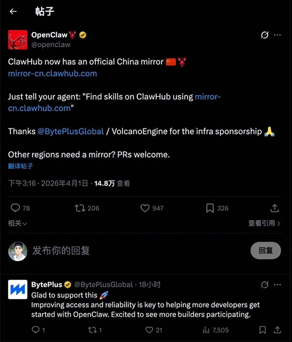 OpenClaw在X平台官宣:在火山引擎的支持下,ClawHub中国镜像站正式启动运营!点击