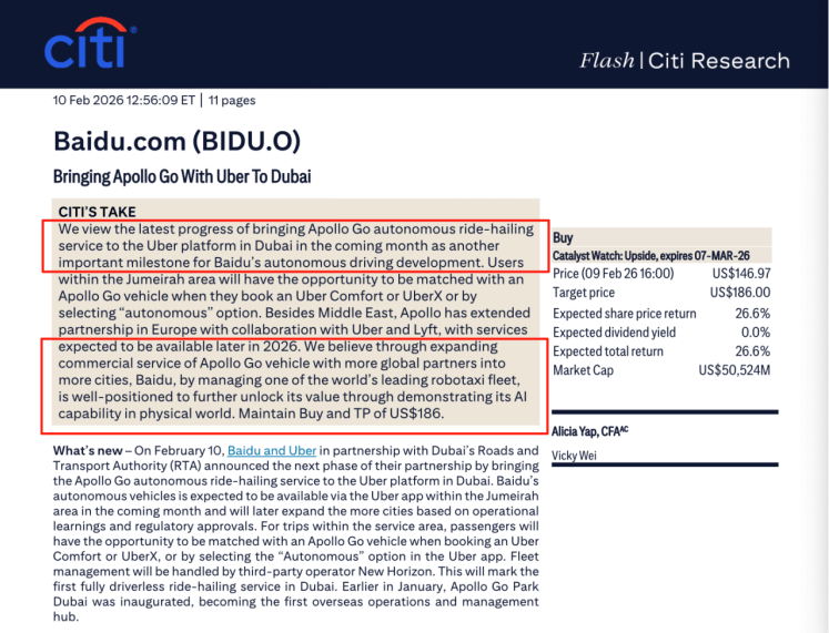 在激烈的国际竞争中,中国科技企业展现出强劲的全球化势头。百度旗下自动驾驶出行服务平台萝卜快跑宣布即将在迪拜启动全无人商业化运营,这一消息引发国际金融机构关注。花旗银行随即重申对百度的"买入"评级,指出其自动驾驶业务已进入价值释放阶段。通过与中东、欧洲等地合作伙伴的深度协作,萝卜快跑正将中国验证成熟的无人驾驶模式向全球核心城市复制推广。