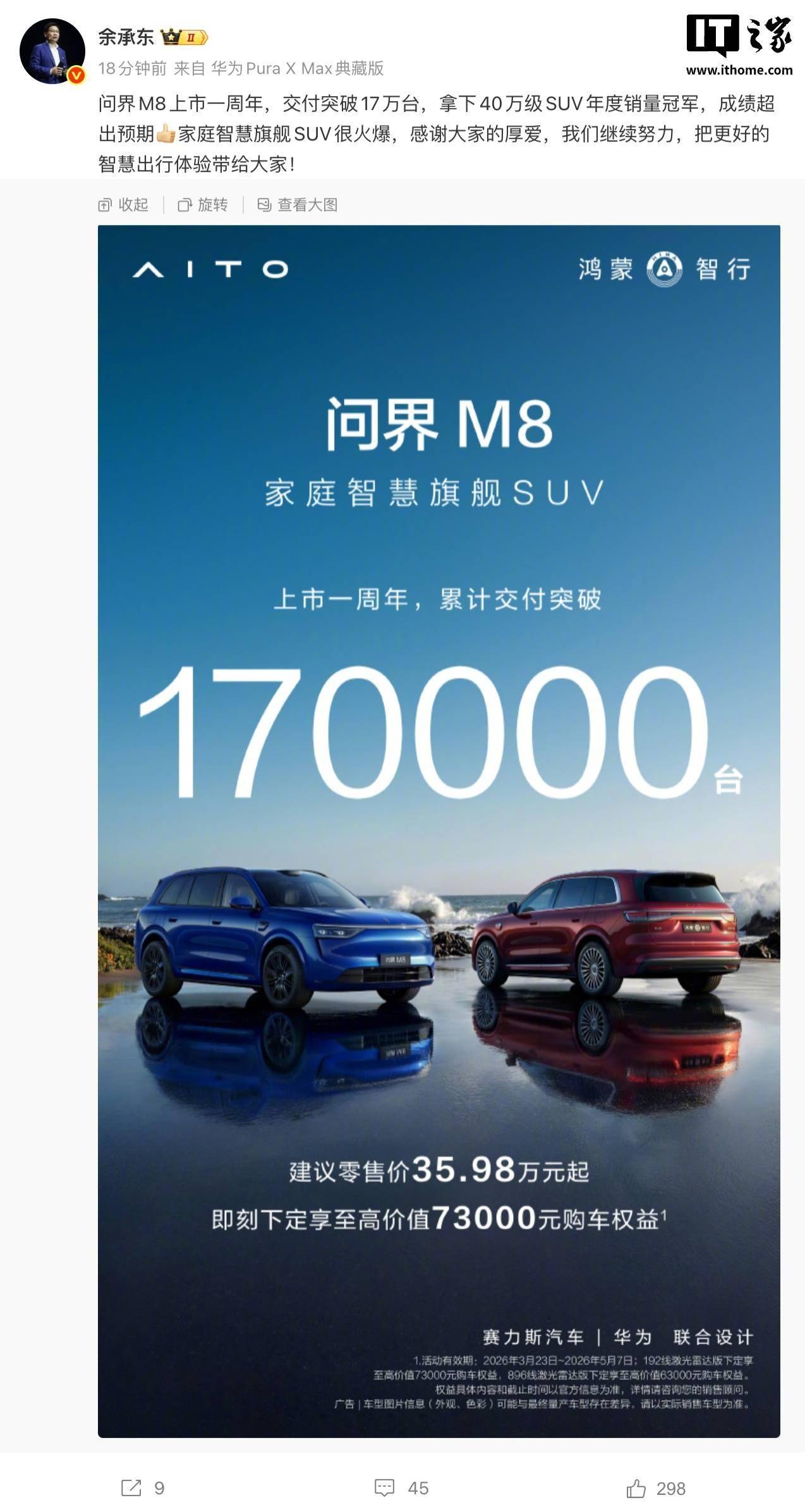 华为常务董事、终端BG董事长余承东近日宣布,鸿蒙智行旗下问界M8迎来上市一周年重要节点,累计交付量突破17万台,成功登顶40万级SUV年度销量冠军宝座。这一成绩远超市场预期,为高端新能源SUV市场树立了新的标杆。