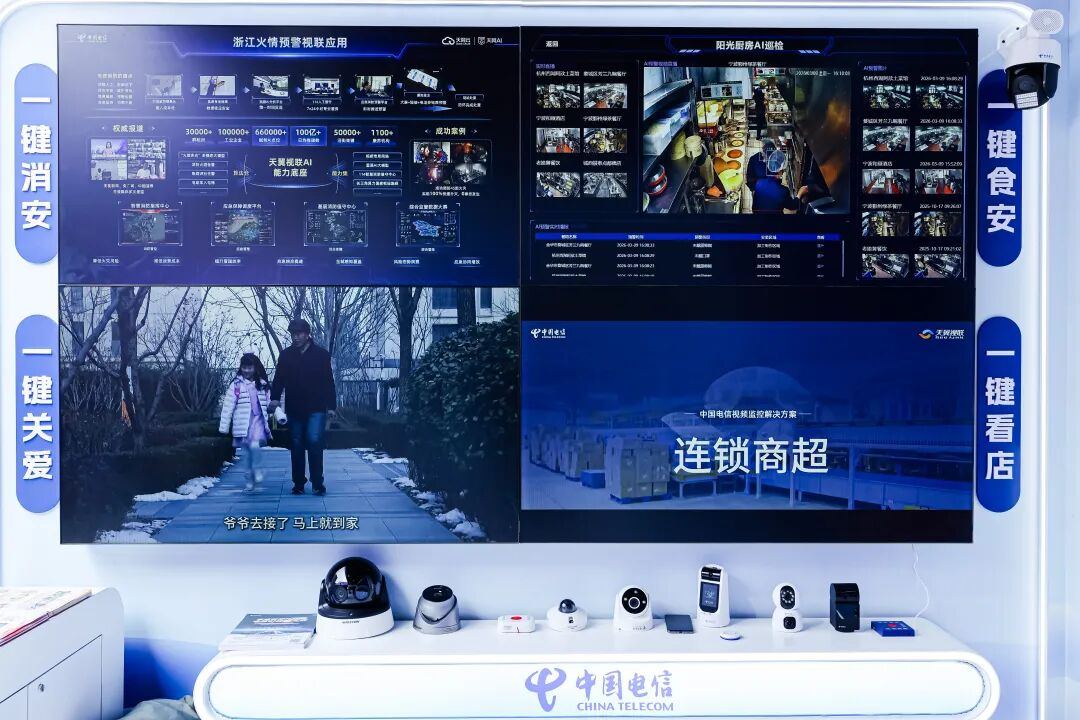 在本次嘉年华展区,中国电信浙江公司以“智屏、智铃、智看、智存”四大板块,全景式呈现AI技术赋能智慧生活的落地成果,让现场观众直观感受数智技术在消费权益保护、日常生产生活中的实际应用。其中“智看”板块,依托天翼视联AI能力底座,集中亮相四个“一键”等核心应用,成为现场关注的焦点,生动诠释了AI技术作为消费者权益保护“守护者”的重要作用。