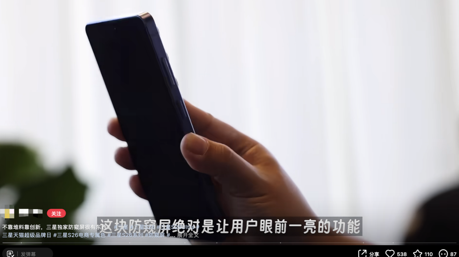几乎每一位评测S26 Ultra的博主,都会花大篇幅介绍那块内置式防窥显示屏——这也是三星首次在手机上实现硬件级别的防窥技术。