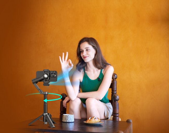 这款主打极致轻便和自带补光。整机410克,折叠后跟手机差不多大,小包也能装,出门完全没负担。配了磁吸补光灯模块,在餐厅拍美食能无极调亮度,食物色泽更自然。可拆卸蓝牙遥控器隔10米远也能控制,一个人出片效率高。它还支持四种手势远程控制,比个OK就能开启跟拍,双手不用碰设备就能完成构图和拍摄。