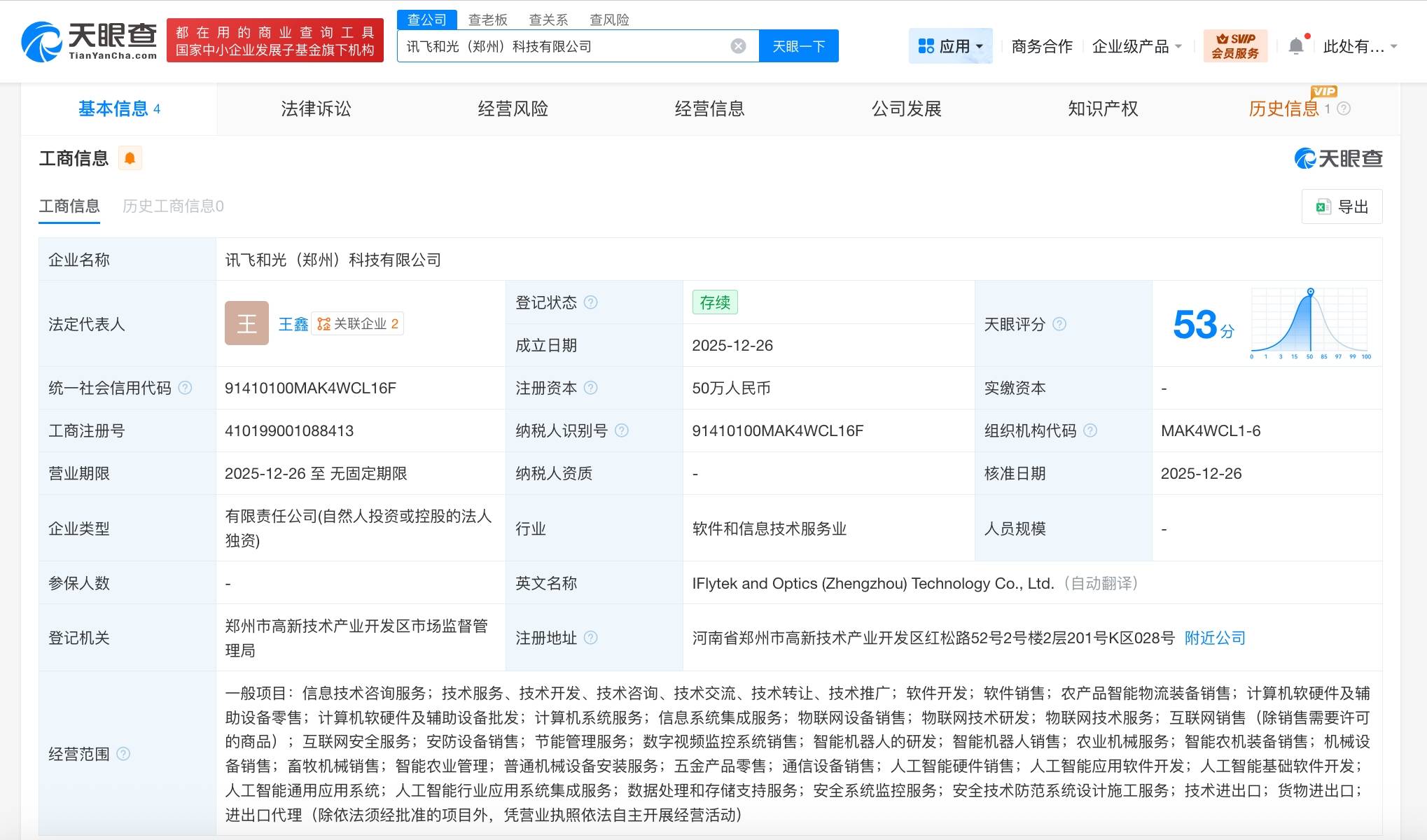 据公开工商信息查询平台显示,一家名为讯飞和光(郑州)科技有限公司的新企业近日完成注册登记。该公司法定代表人为王鑫,注册资本金达50万元人民币,注册地位于河南省郑州市。