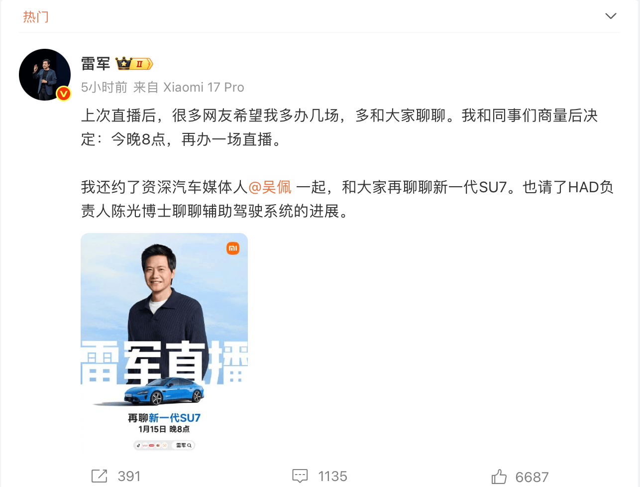 据悉,此次直播是雷军2026年以来开展的第三场公开直播。此前,他在1月3日的直播中带领工程师团队拆解小米汽车,直接回应产品质疑,峰值观看人数突破千万;1月7日的直播中,他首次详细解读新一代小米SU7,公布该车22.99万元起的预售价格及全系标配激光雷达等核心配置信息,并针对涨价、营销争议等舆论热点进行回应。