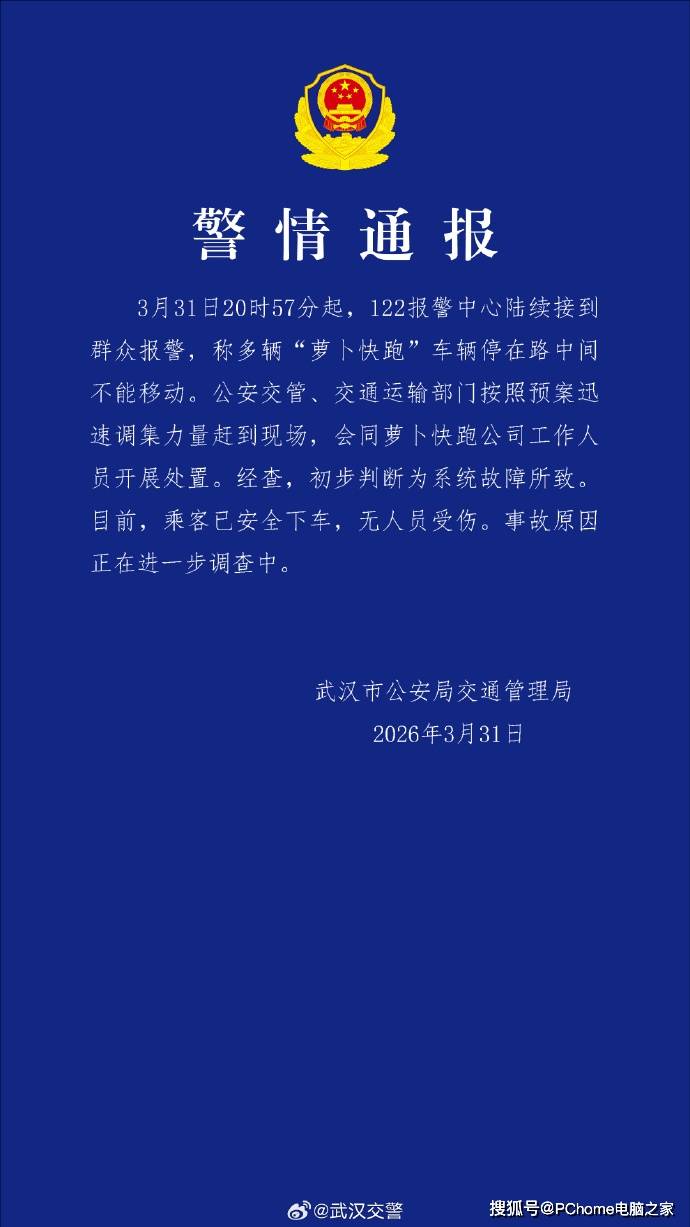 武汉市公安局交通管理局发布通报,确认3月31日晚间多辆“萝卜快跑”自动驾驶车辆在武汉市区道路出现集体停滞故障。据初步调查,事故由系统异常引发,未造成人员伤亡,具体原因仍在深入核查中。